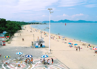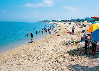 家族連れや子供の多い海水浴場です。西の端の埋立地には、ウォータースライダーのあるプールもあります。
