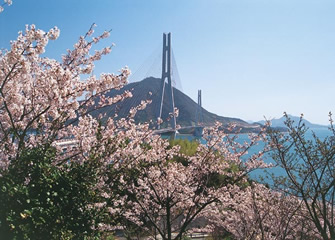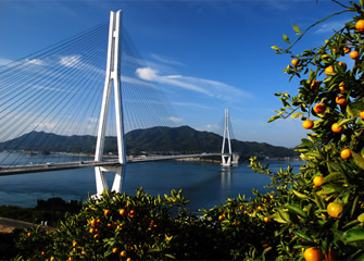 多々羅大橋は橋長1480m、中央支間長890mの世界有数の斜張橋で、フランスのノルマンディー橋と姉妹橋縁組をしています。塔頂の高さは海面より226mあり、このルートの中で最も高くなっています。当初は吊橋で計画されていましたが、斜張橋の技術の進歩を背景に、自然環境の保全や経済性などを考えて変更され、7年の工期を費やして平成11年5月1日に開通しました。鳥が羽を広げたような優美な姿が特徴です。